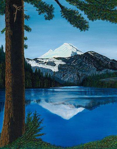 Crystal Lake - A picturesque scene that can be found in the western United States where a crystal lake has postured the reflections of a distant glacier mountain range as well as an adjacent mountain range with its alpine forest. Since a Ponderosa Pine covers the outermost perimeter of the painting, the perspective is so true that it has three-dimensional depth and gives the illusion that you are looking out your window.