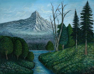 Daybreak Splendor - This particular piece is a rendition of Eric’s desire to display his intrigue of a glacier mountain. The respite of this idyllic European forest has a mystical value and yet offers calmness as a result of the cohesion between the mountain peak and water stream. This is a very popular piece since Eric gives you a fine glacier mountain choice in his collection of mountains and trees.