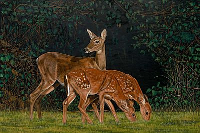 Deer In My Backyard – This is a view Eric sees often in his wooded backyard – a doe with her fawns. Eric has stunningly captured the characteristics of a mother who is very cautious of the sites and sounds that are all around her young ones.