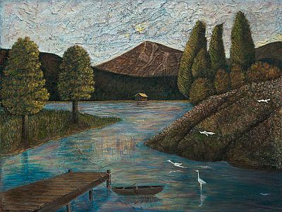 Serenity Awakens – It is my staunch desire for you to be able to step onto the pier and enjoy this vibrant lakeside view with the sweet morning greetings of the birds and hear their songs and perhaps take the boat and escape deeper into paradise. Pastel colors blend into rich, dark umbers which then give the painting different looks as the intensity of the hues change in direct proportion to the variation of the illumination in the room.